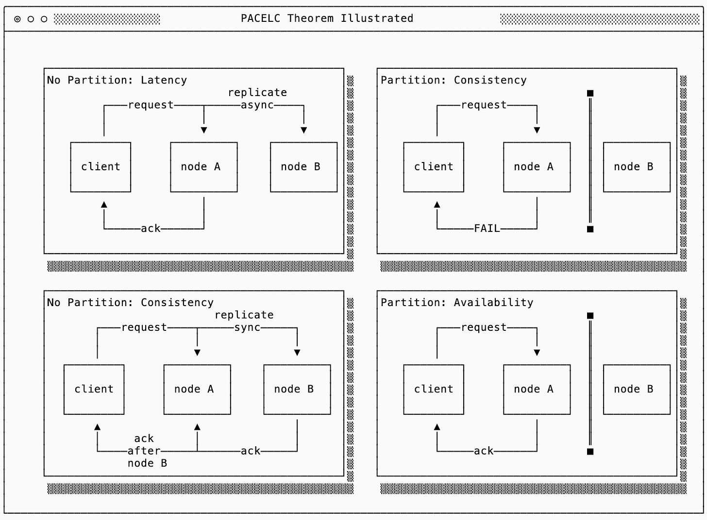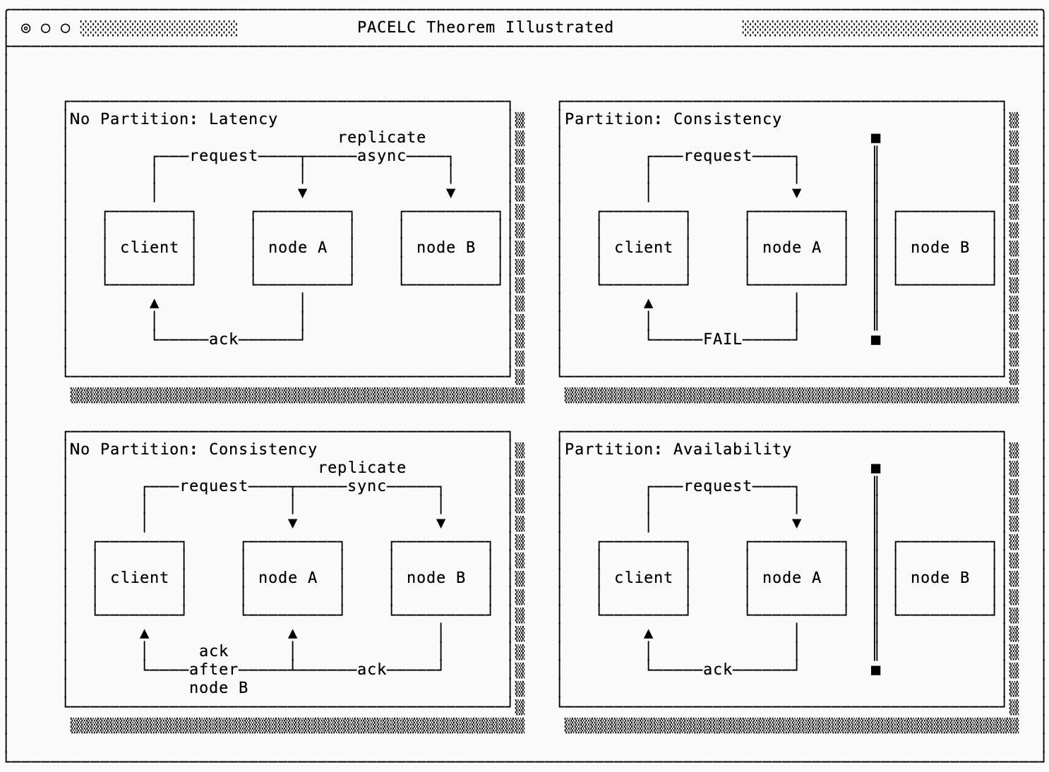 For reasoning about availability in a distributed system, the PACELC framework is an evolution of the widely referenced CAP theorem. In steady state, you trade off between latency and consistency — only during a network partition do you choose between availability and consistency.
