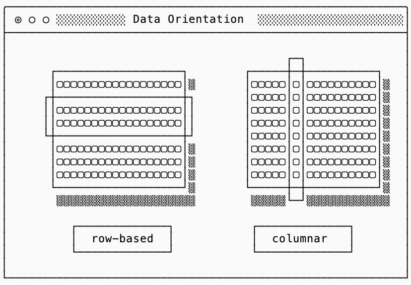 The primary difference between the way databases store raw data is the way that data is oriented: row or columnar. If your workload reconstructs complete rows choose a row-based data system. If your workload aggregates values across rows choose a columnar system.