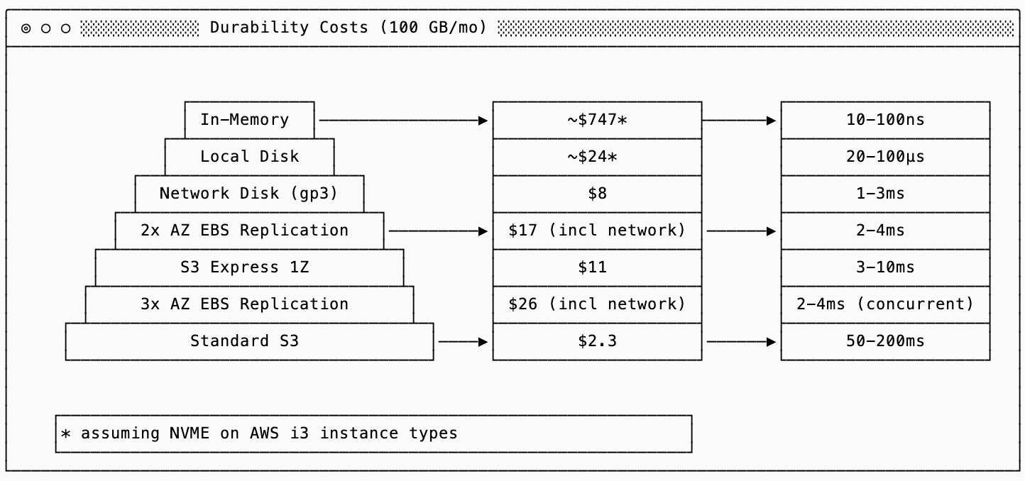 Once you’ve made your decision on how durable your data needs to be, the next choice is where to store durable data. The chart below shows the latency and cost deltas between different solutions: