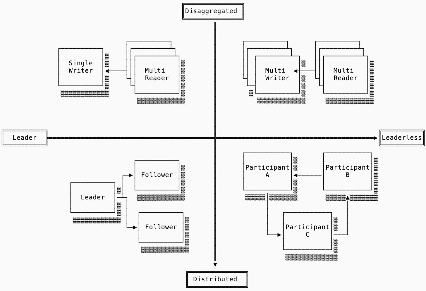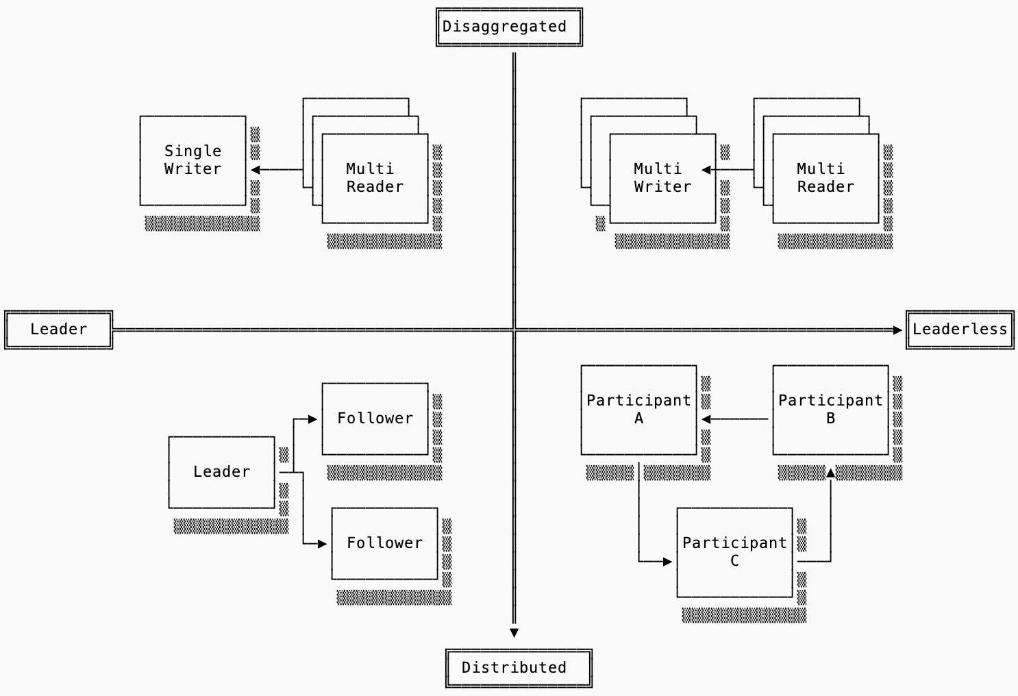 Single Writer, Multi-Reader: a single-node system with the additional feature of writing to shared storage (e.g. S3) so other readers can read it. Example: slatedb