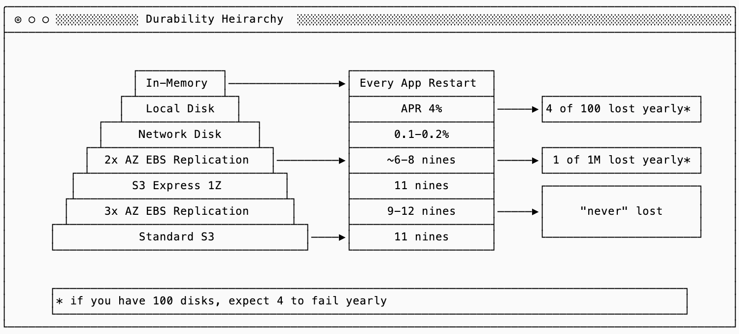 In coupled storage and compute systems, durability was more closely tied to availability. If you were running with 3 replicas across zones and prioritized consistency then you had three nodes that potentially had the data in memory, making durability of the storage a slightly less important concern. In a disaggregated system you no longer replicate within the compute subsystem and delegate that to object storage, the tradeoff becomes more acute.
