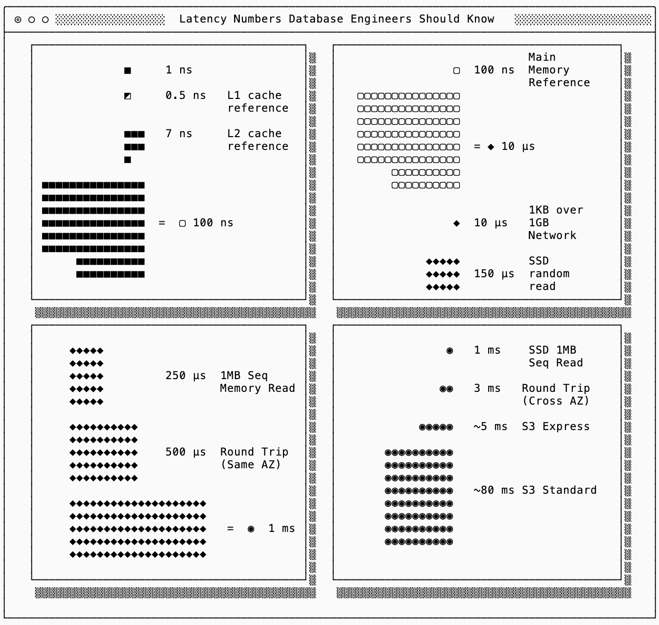 There’s the famous Latency Numbers Every Programmer Should Know chart2 from Jeff Dean that helps reason about why I/O efficiency is so important.