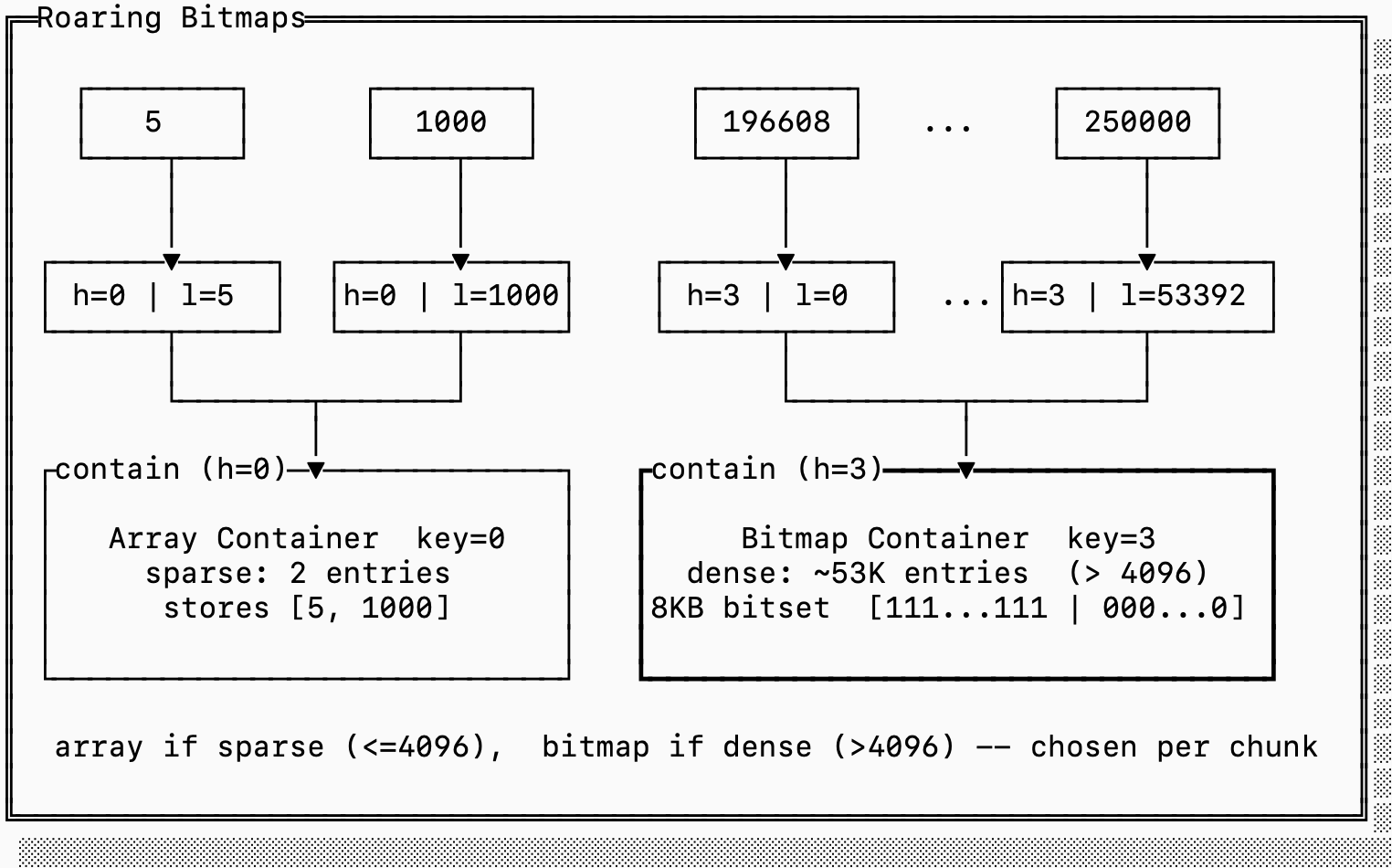 If we were to encode the sparse block with a full bitset it would take 8KB since we need one bit for every value that starts with 0x0000. But since there are only two numbers, it’s more efficient to just encode 4 bytes (the lower 16 bits for each 5 and 1000).