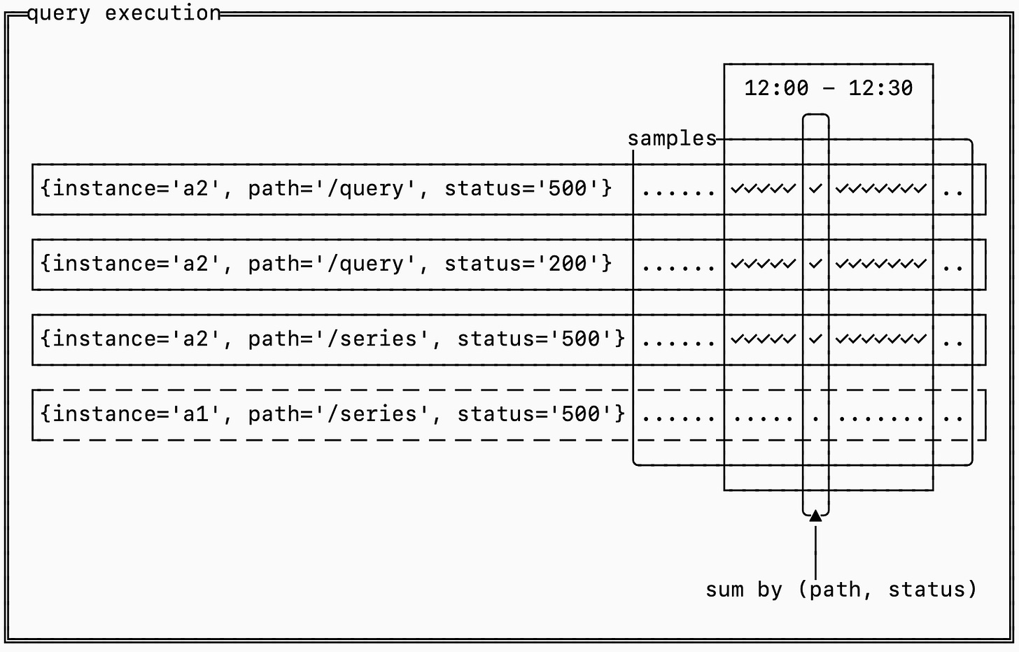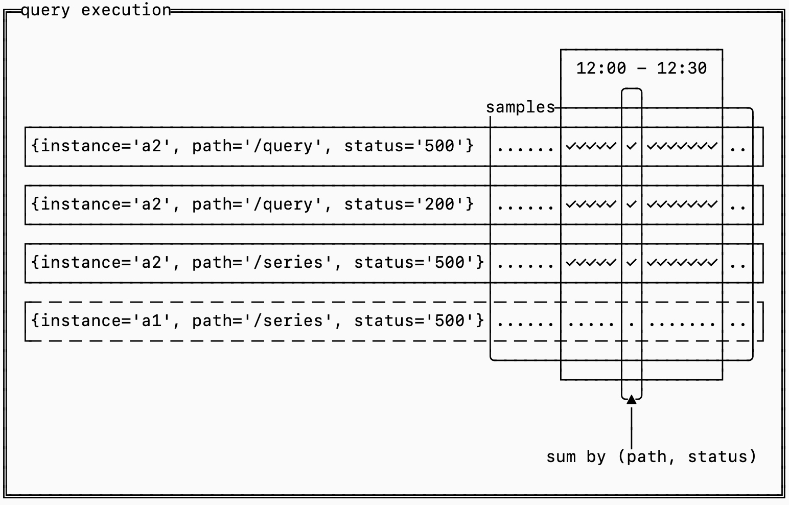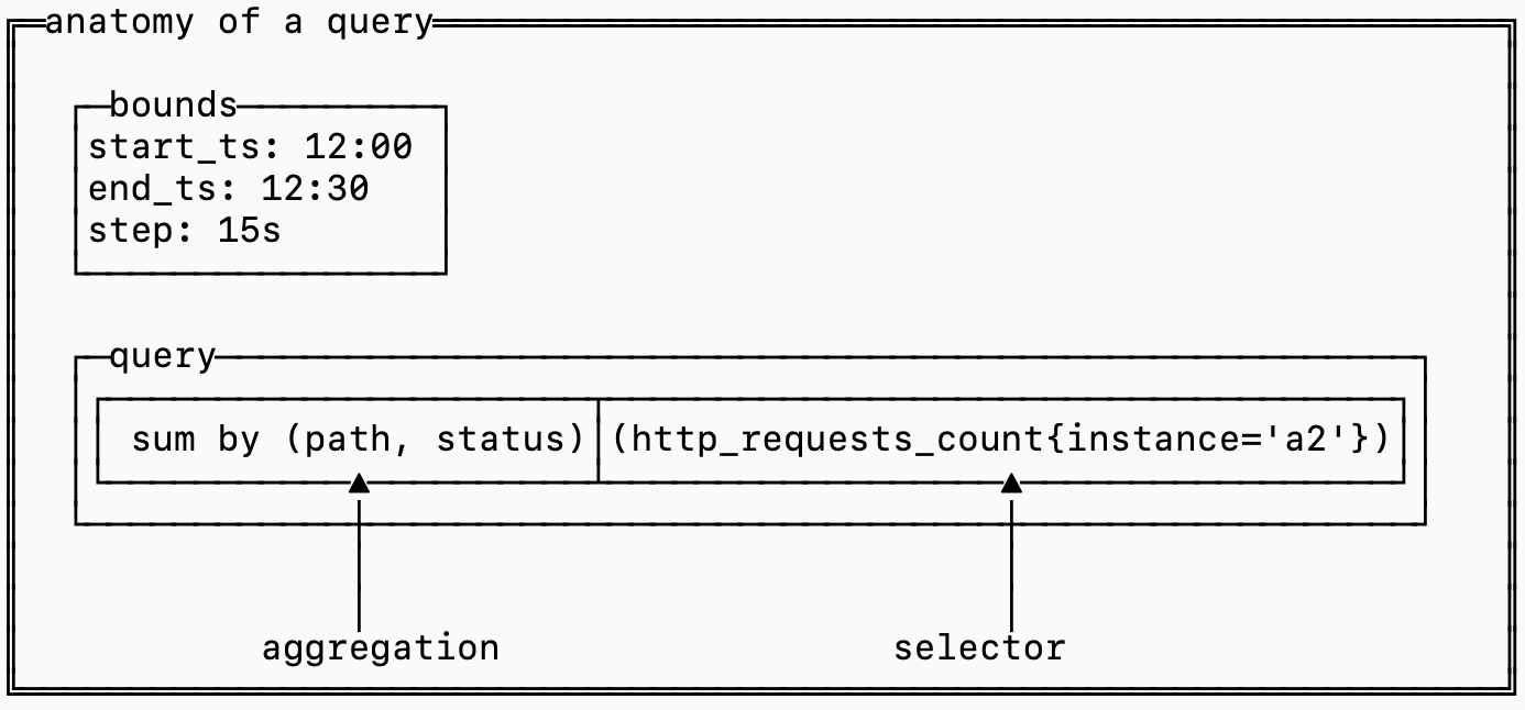 {instance='a2', region='us-west-2'}).Queries distill series into useful information. Typically there is too much information to directly examine series. If you have thousands of nodes, you might want to look at the CPU utilization on average to know if you have well utilized cores.