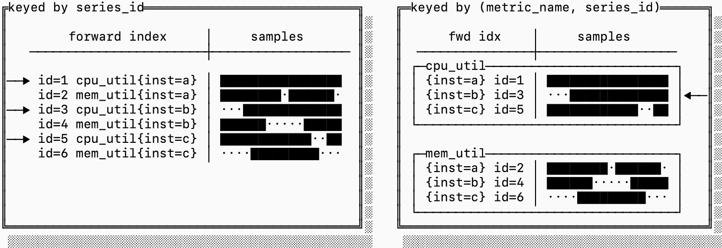 The layout on the right sorts the forward index and samples based on a composite key of (metric_name, series_id) instead. This means that consecutive series IDs are not necessarily clustered, but blocks on disk are dedicated to a single metric. If you need to fetch many series for the same metric, this can be significantly more efficient.