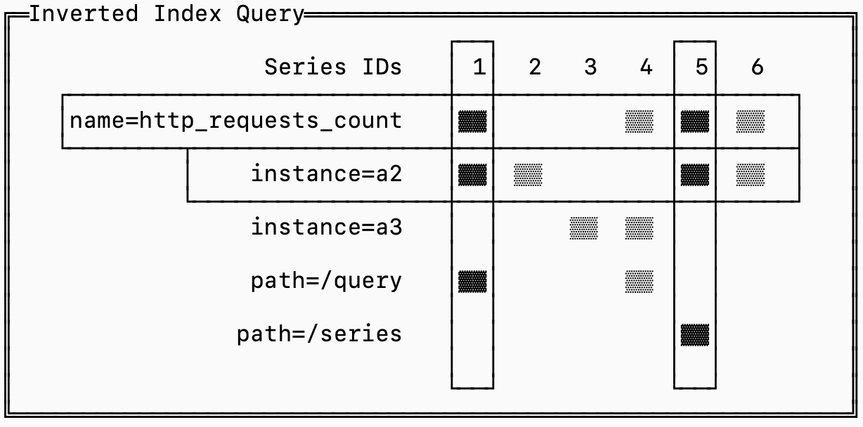 An inverted index is used to narrow down which series need to be fetched