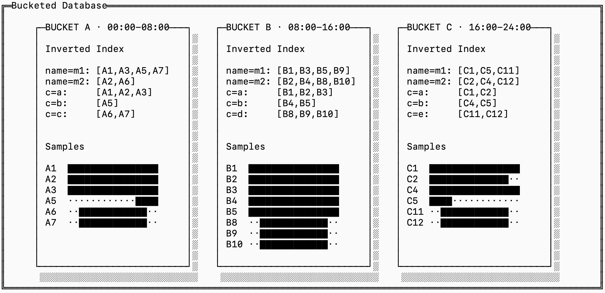 The solution to this is bucketing: storing a full trio of samples, inverted and forward indexes for each “bucket” of time. The series IDs are also scoped to a bucket, which allows you to quickly find the series ID for incoming data without looking through the entire history of series.