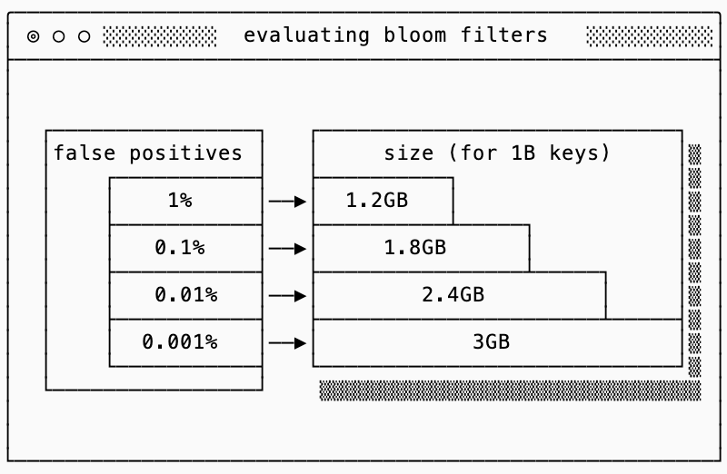 Bloom filters are more complicated and come with some interesting tradeoffs. There have been many sources that explain how these filters work, if you’re curious the Wikipedia page has an excellent overview. If you’re not, the important thing to understand is that they’re a probabilistic data structure that can tell you with 100% certainty that a key does not exist in SST but it cannot guarantee that a key does exist. Their accuracy is measured by their false positive chance: each false positive means you need to dig into the index and data blocks unnecessarily, finding out that the key in fact does not exist.