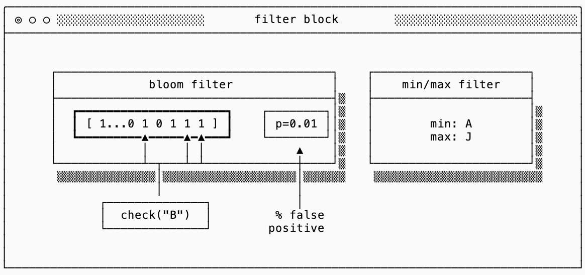 If you setup your storage like that, it is helpful to know whether or not a given SST has the key you’re looking for before you even try reading the index and data blocks. This information is stored in a filter block, and there’s typically two forms of filters that are used: min/max filters and Bloom filters.