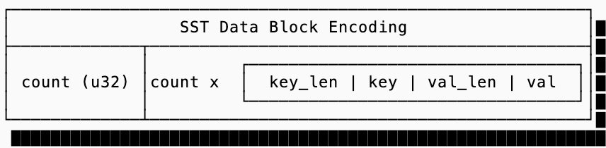 But this relies on the in-memory representation of the SstDataBlock. We still need some way to get this struct onto disk which only understands simple byte arrays [u8]. There are many strategies for serializing the data block of an SST; production data systems will often use techniques such as prefix encoding for keys and varint encoding for lengths to reduce the amount of space a block takes up but for this exercise we’ll do something simpler: we’ll just encode the block as: