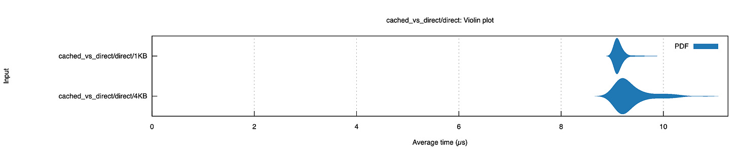 4096To see this in action, I ran an experiment measuring read latency for 1KB vs 4KB reads using Direct I/O (bypassing the OS page cache). Despite requesting 4x less data, the 1KB reads took about the same time as the 4KB reads (about 9.2µs) on my SSD1: