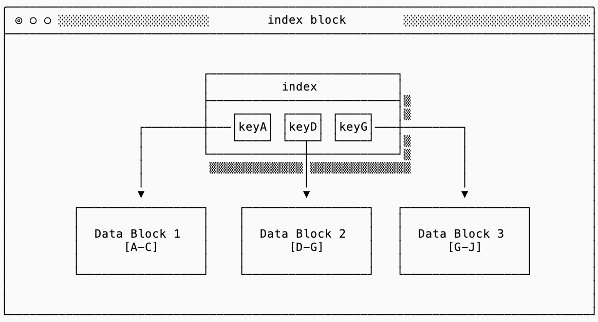 Simply storing data as a series of sorted blocks, however, isn’t ideal. If that’s all you did, your query algorithm would end up reading blocks in a binary-search pattern fetching entire blocks to decompressing them just to see whether or not the key you’re looking for is even within the range of the block.